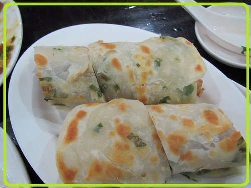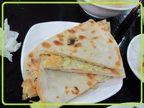 蔥油餅加蛋 $40 : 蔥油餅吃起來不油,一樣滿滿的麵粉香味,是脆脆酥酥的口感,味道很淡,但沾上鍋貼醬就變成美味到不行,好好吃一口接個一口!