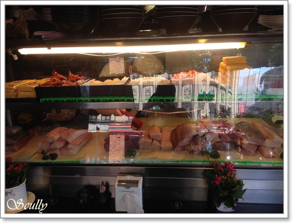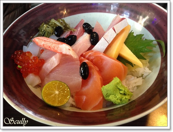 生魚片蓋飯$250:海帶絲、軟絲、鮭魚卵、玉子燒、黑豆、蟹肉棒、鮭魚、鮪魚、旗魚、金桔,搭配的是冷醋飯,看起來超豐盛的,魚肉都挺新鮮甘甜油脂豐富,醋飯份量雖然不多但配料超多,吃起來也相當有飽足感~