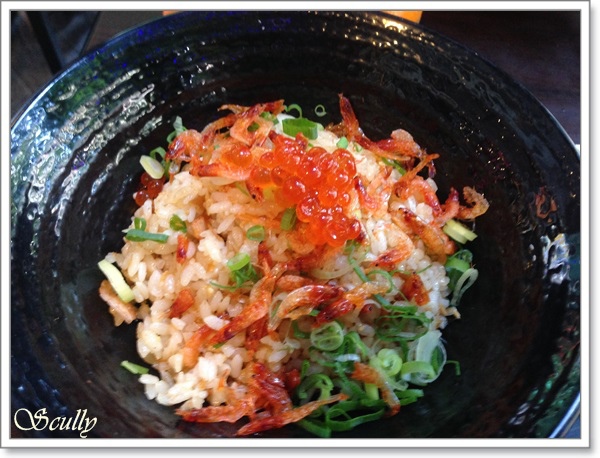 XO醬櫻花蝦鮭魚炒飯,也滿大碗的,上面佈滿櫻花蝦、鮭魚卵、蔥花,吃不太出來XO醬的味道,幸好我也不喜歡XO醬,飯炒得粒粒分明乾爽有嚼勁,櫻花蝦酥酥脆脆,搭起來好好吃~我好想再吃一碗ㄜ!!!