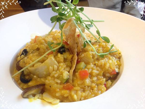 南瓜時蔬燉飯$220:香濃澄黃的南瓜燉煮呈綿軟柔嫩的滑醬狀在與飯結合,滿滿南瓜清甜滋味在加上大量時蔬,一入口就是甜、滑、順、清晰的口感,也是很棒的作品。