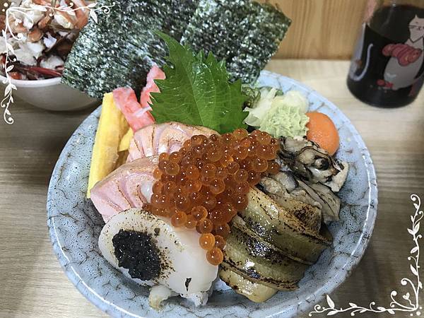 炙燒盛合海鮮丼$400:小小的碗裡面有滿滿的海鮮料,有鮭魚、花枝、紅甘、星鰻、北海道干貝、牡蠣、比目魚、鮭魚卵、玉子、蟹棒、紅蘿蔔.